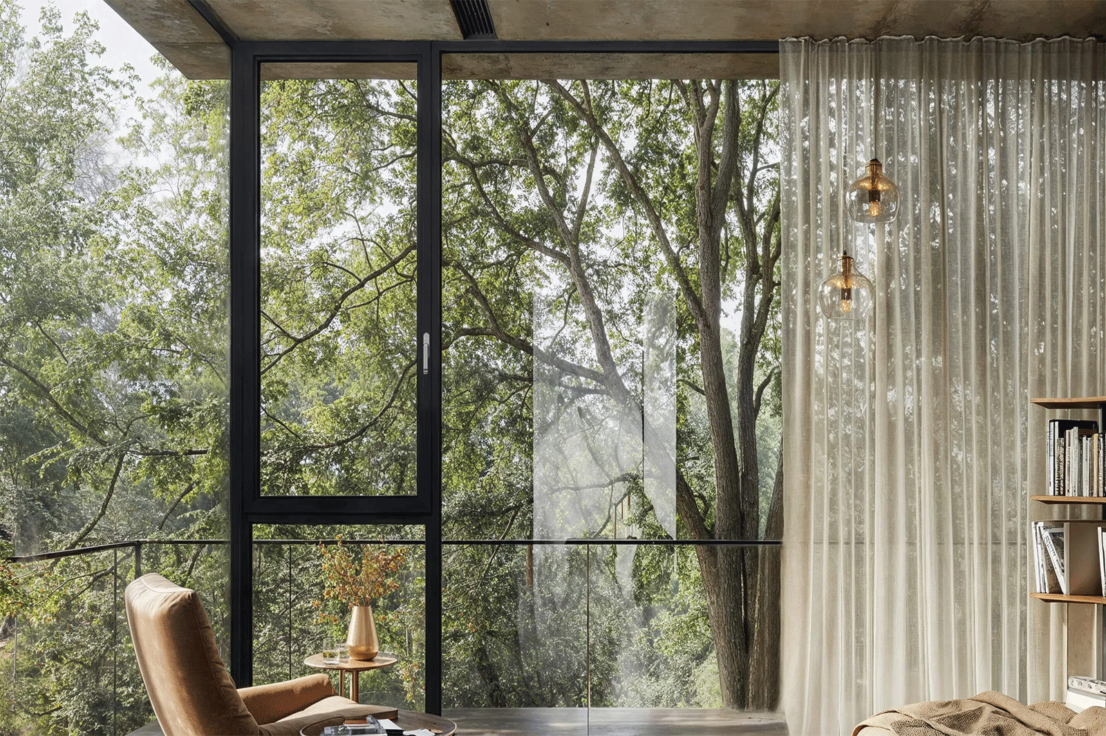 框扇室內(nèi)外平齊設(shè)計(jì),線(xiàn)條簡(jiǎn)約利落,立面效果簡(jiǎn)潔平整。窗扇開(kāi)啟狀態(tài),開(kāi)啟扇與建筑外立面平行。